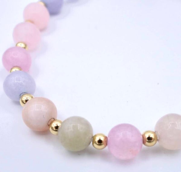 6 mm morganiet stenen afgewisseld met 3 mm gouden kraaltjes.