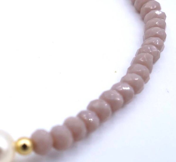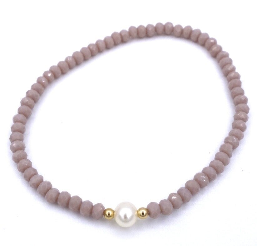3mm facet geslepen grijze glaskraaltjes met 2 gouden 3 mm kraaltjes en een grote zoetwarterparel.