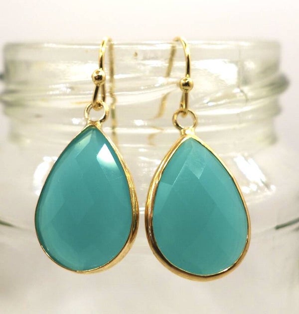 Turquoise glassteen in goldplated zetting, met gouden oorsteker.
