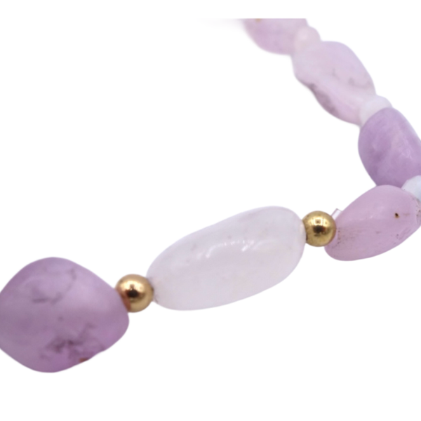 Natuurlijk vorm kunzite stenen afgewisseld met 3mm gouden kralen en lichte Morganiet kralen. Met 1 centrale grotere rozenquarts
