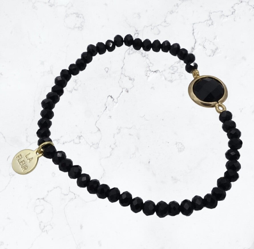 Zwarte facet geslepen glaskraal met een grotere gefaceteerde glassteen in 14 K goldplated zetting.