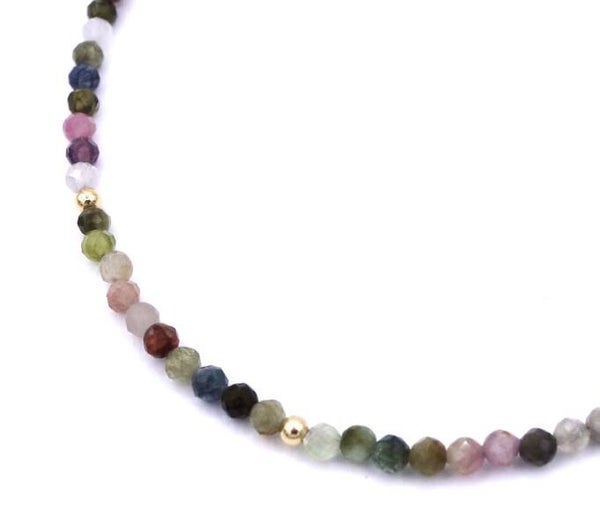2 mm facet geslepen tourmalijn steentjes afgewisseld met 14k goldplated kralen en een gold plated slotje.