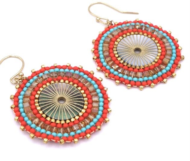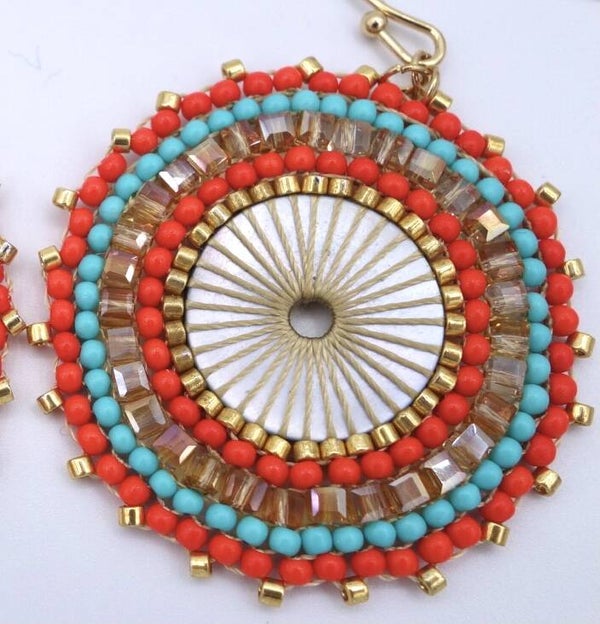 koraal roden kralen afgewisseld met turquoise en goudkleurige kralen. De diameter is 3,5 cm.