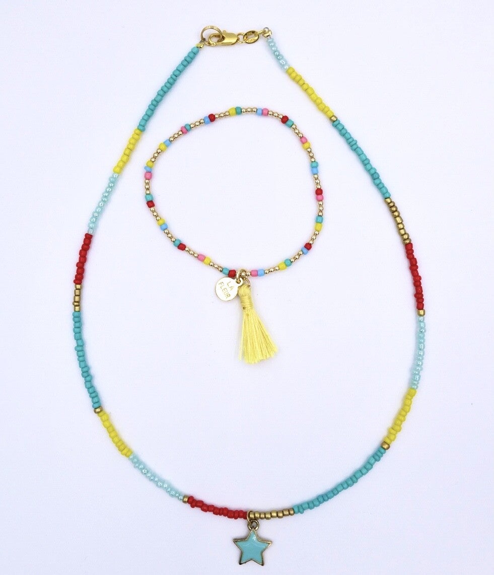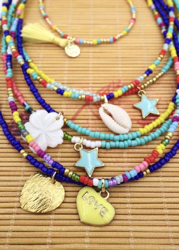 Zomerse kraaltjes ketting met de kleuren geel, goud, turquoise, rood en lichtblauw