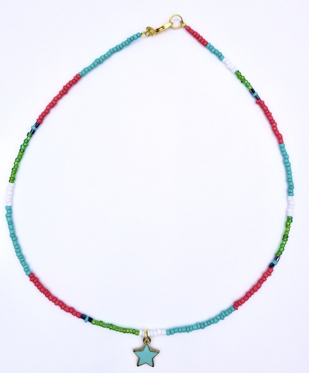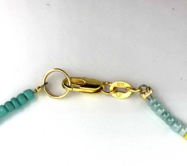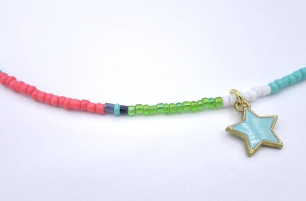 Zomerse kraaltjes ketting met de kleuren zachtroze, turquoise, wit, groen en donkerblauwe glitter accent.