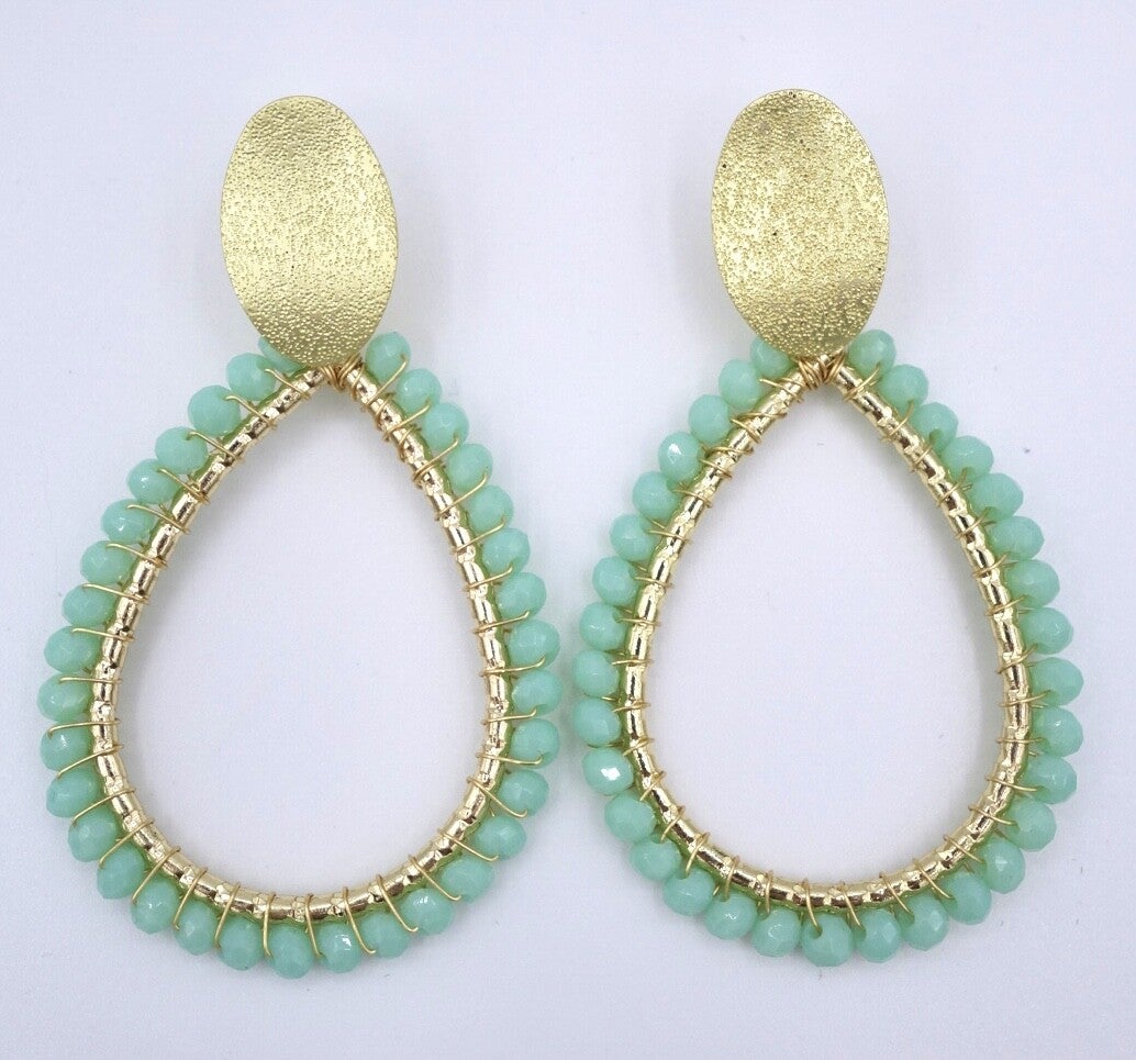 Turquoise facet geslepen glaskraaltjes aan een goudkleurige druppelvorm. De oorstekers zijn van een edelmetaal en de sluiting van 316L ( stainless steel) en is daardoor anti allergisch.