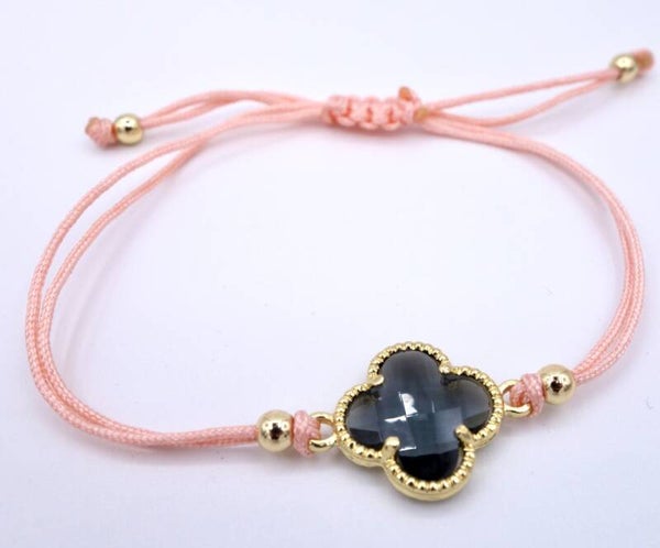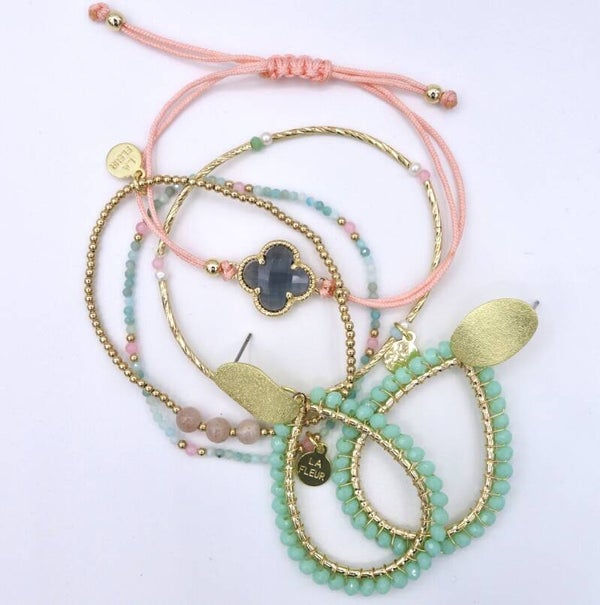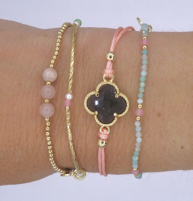 en een schuifarmbandje met 14k goldplated kraaltjes en een facetgeslepen glaskraal in klavervorm in goudkleurige zetting.