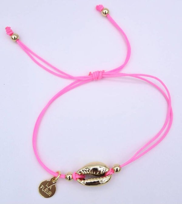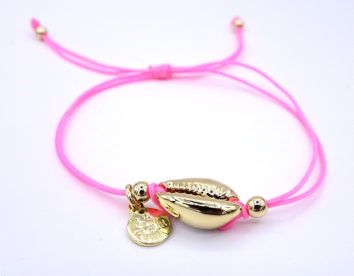 Verstelbaar armbandje met fuchsia roze band en goudkleurig schelpje en goldplated 'LaFleur' bedel.