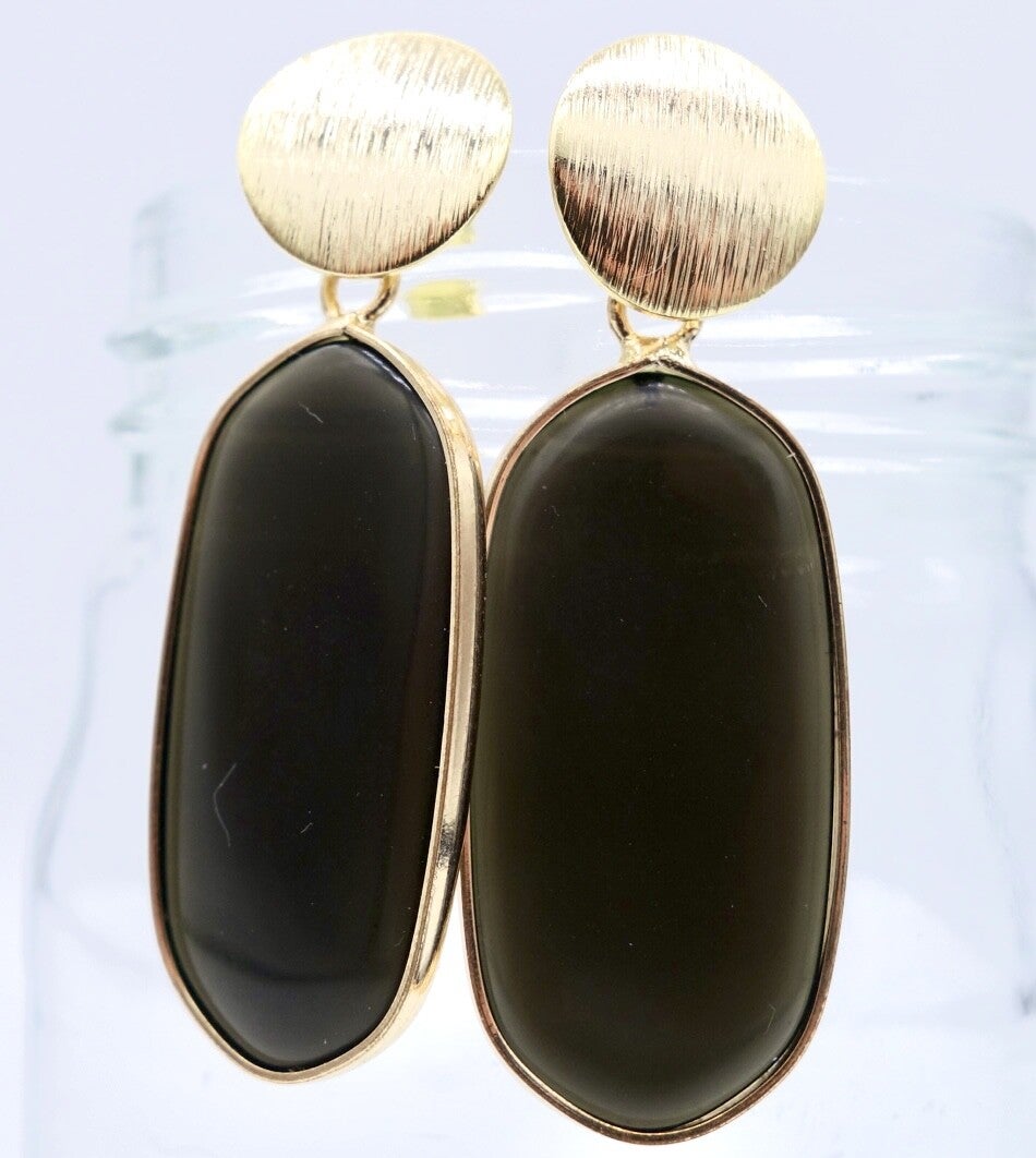 Zwarte Onyx steen in 14k goldplated zetting. De oorsteker heeft een zilveren steker en 316L stainless steel achterkantje. De voorkant van de oorsteker is ook van een edelstaal met goldplating.