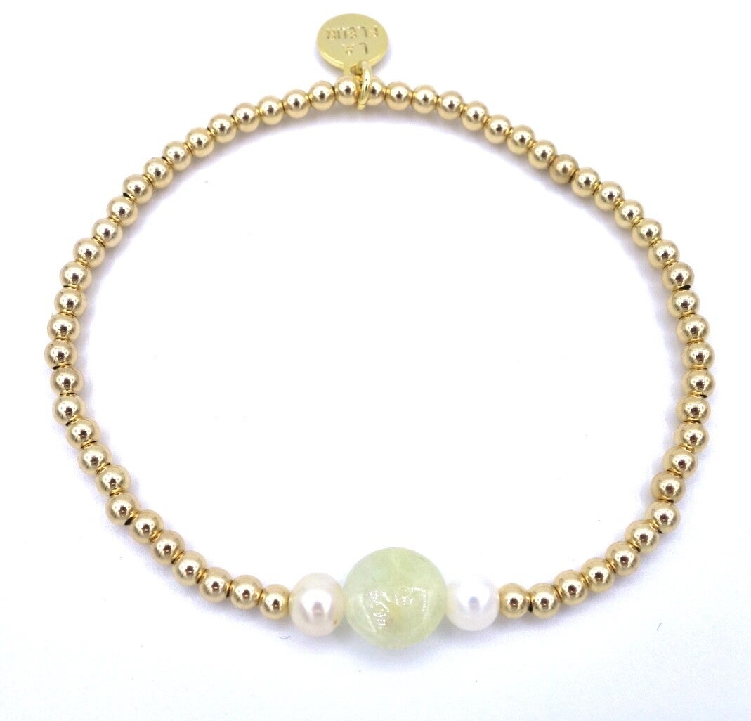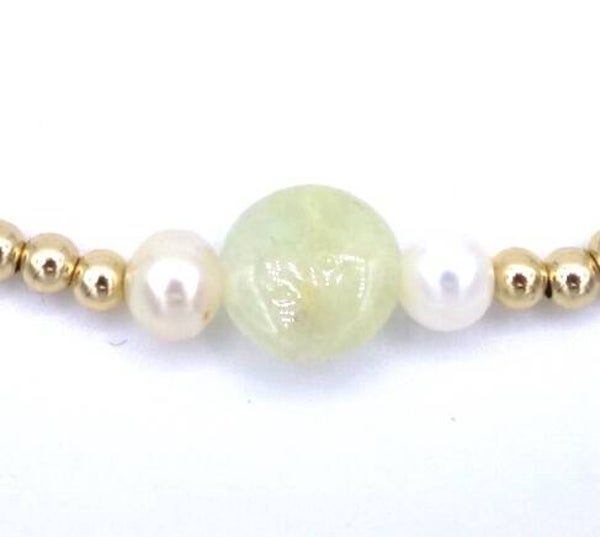Morganiet steen met 2 zoetwaterparels en 14k goldplated kralen. Verkrijgbaar in S(16 cm) en M (17cm) en op verzoek in andere maten .