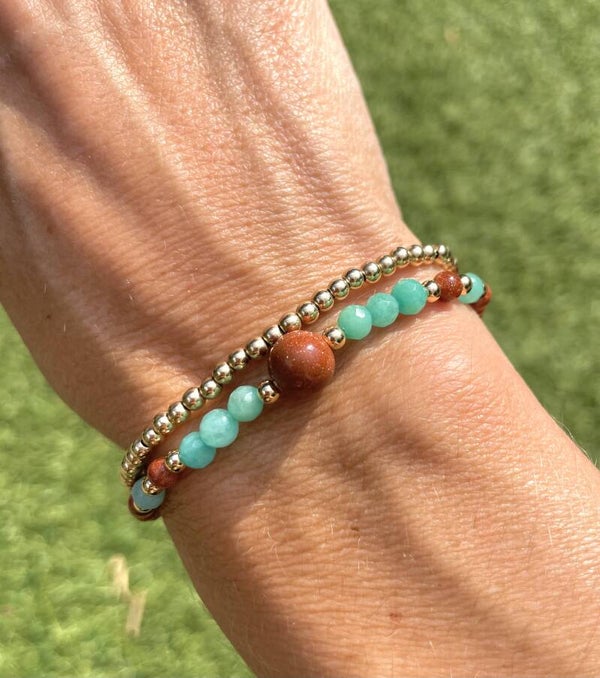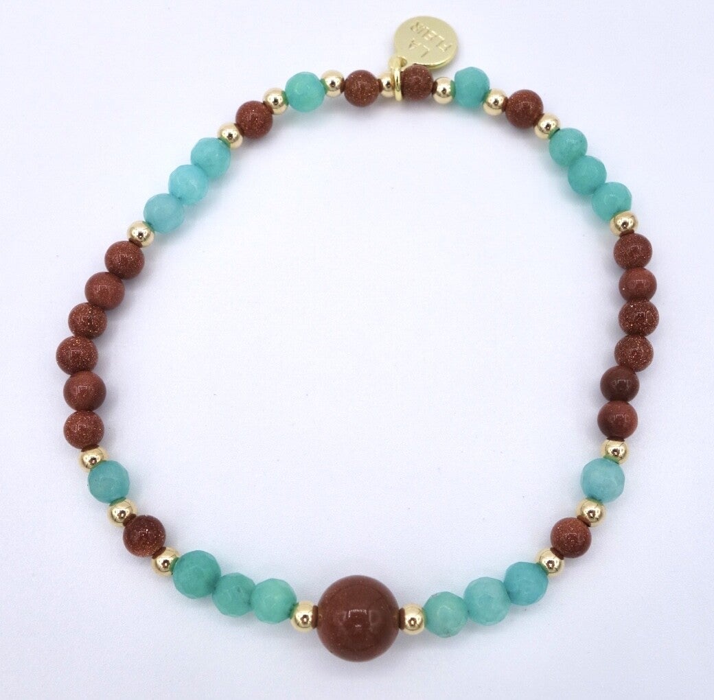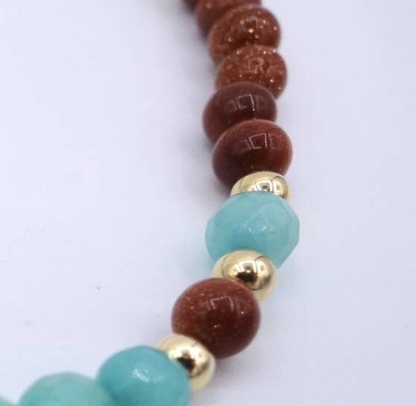 Grote gouden zandsteen kraal met kleinere 4 mm gouden zandstenen en lichtblauwe / turquoise jade en 3 mm 14k goldplated kraaltjes.