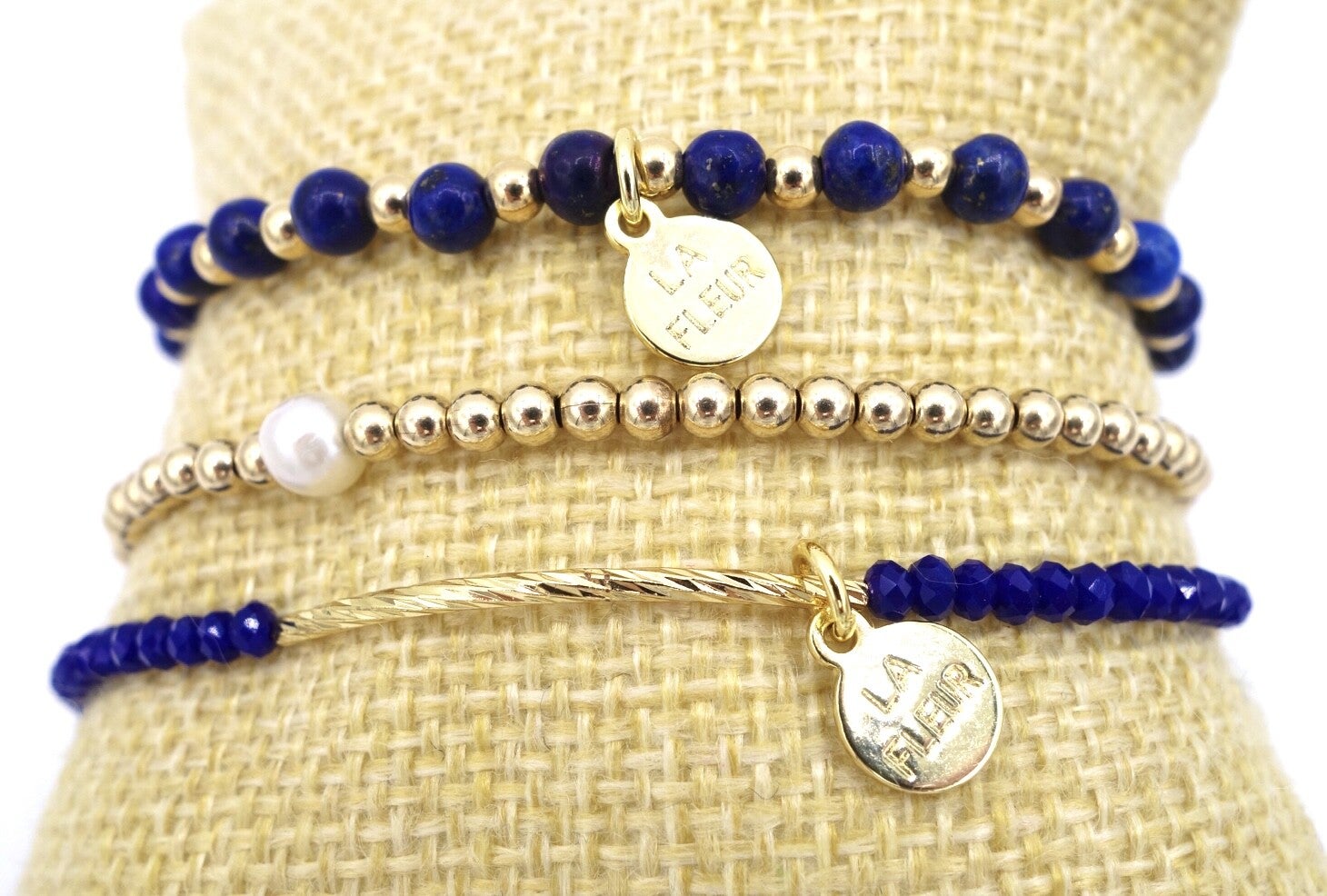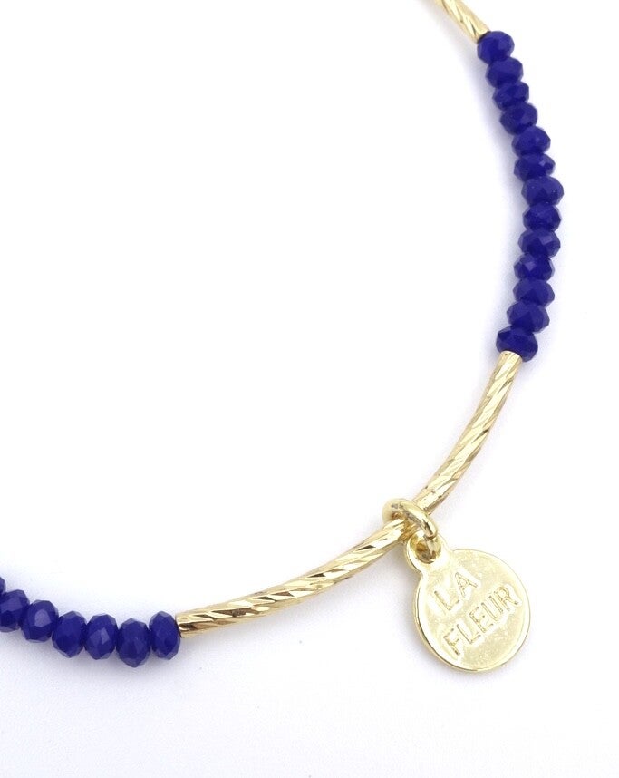 Facet geslepen blauwe glaskraal, afgewisseld met 3 14k goldplated slaafjes. Samen zorgt dit voor een speels effect