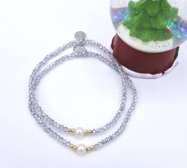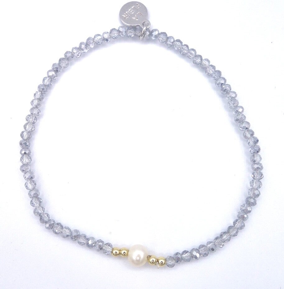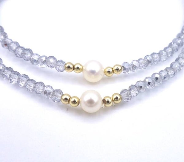 Zilverkleurige facet geslepen glaskraaltjes met 4 goldplated kralen naast een grote zoetwaterparel. De maat is een M(17cm).