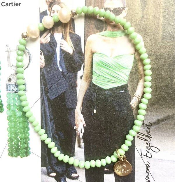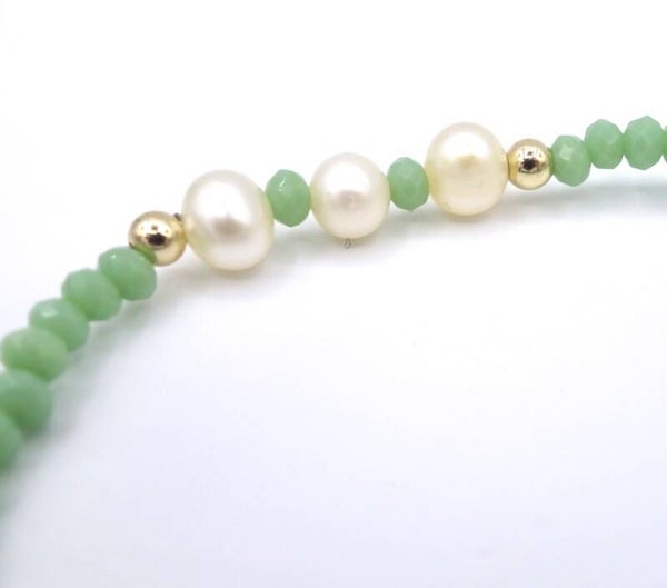 Licht groene 3 mm facet geslepen glaskraaltjes met 3 zoetwaterparels en 2 14 k goldplated kraaltjes