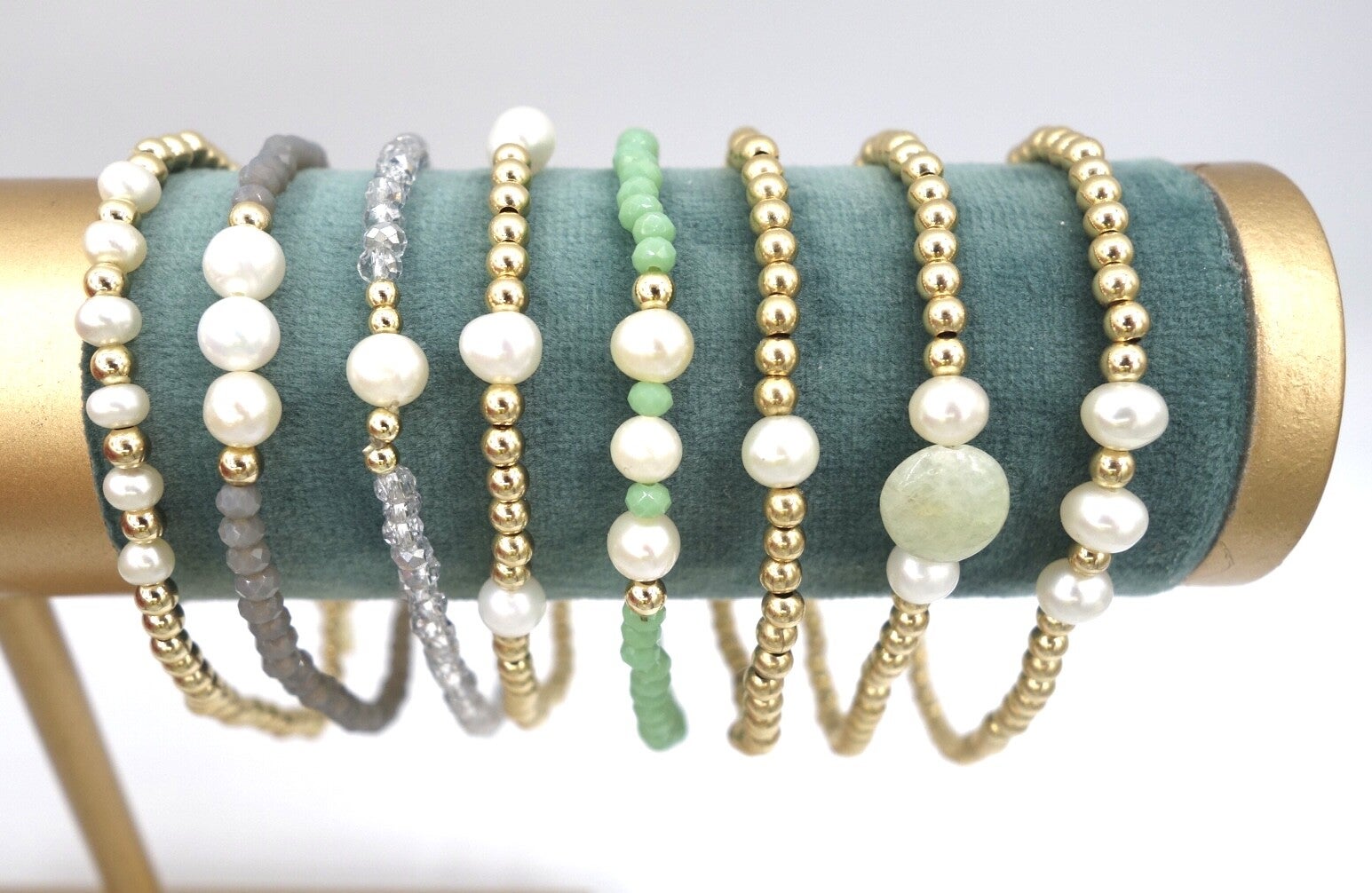 Kleine parel met groene glaskraaltjes