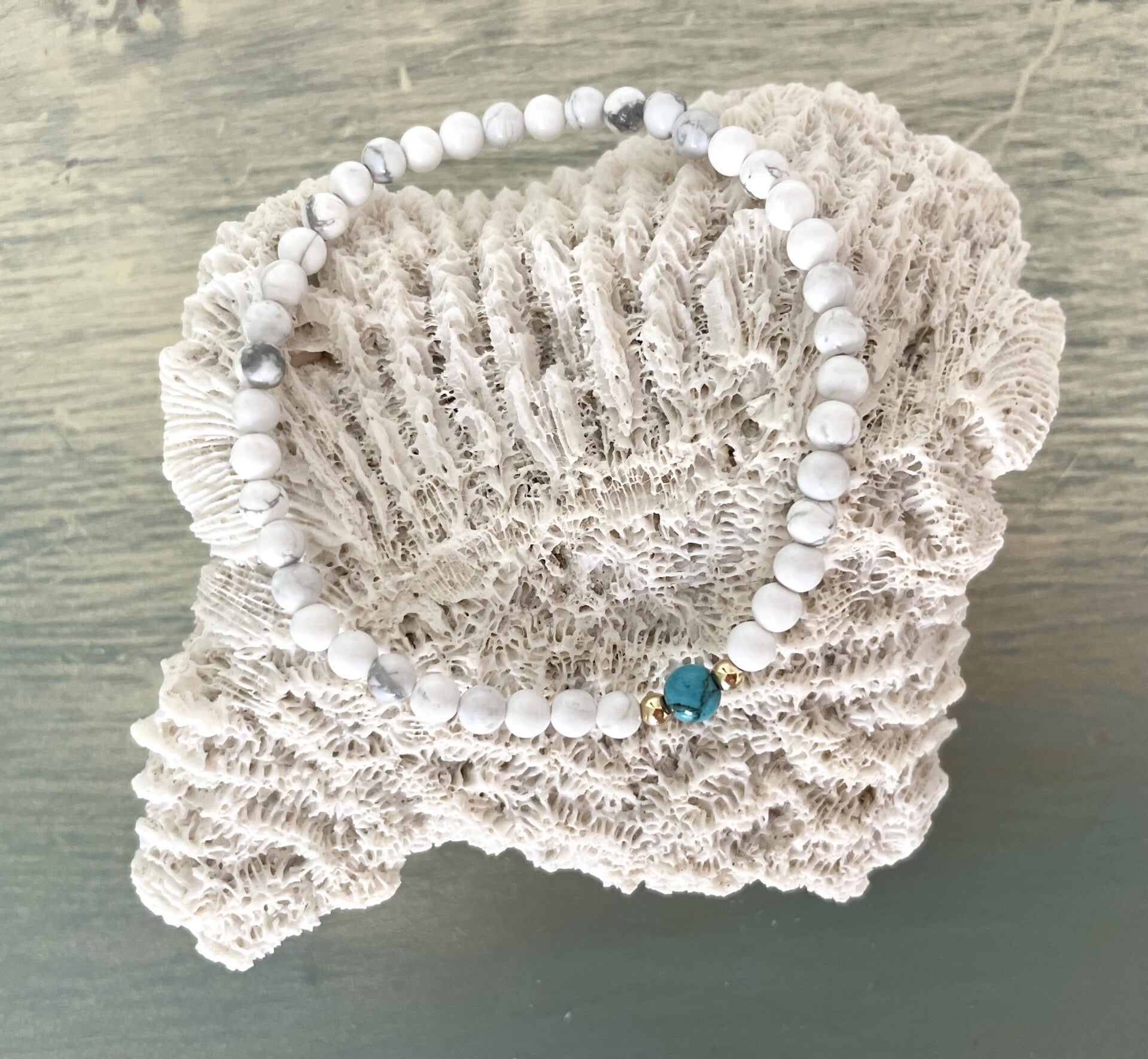 3mm witte turquoise steentjes met 2 gold plated 2,5 mm kralen en een blauwe turquoise steen.