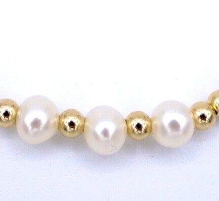 arband met 6 of 3 zoetwaterparels en 3 mm 14 k goldplated kralen en klaver steen met 3 mm 14 k goldplated kralen.