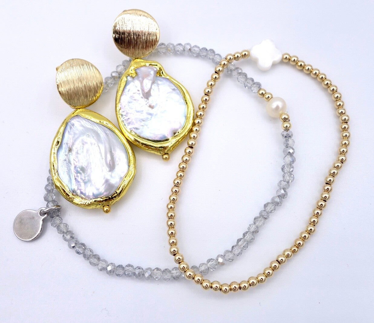 grijze facetgeslepen glaskralen met parel en paar gouden kraaltjes.
