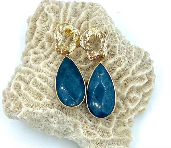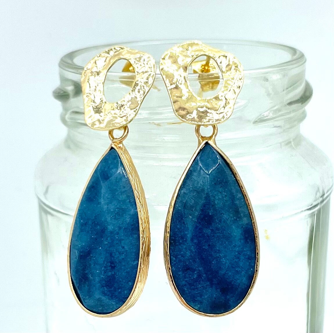 Blauwe natuursteen in goldplated zetting met bijzondere goldplated oorsteker